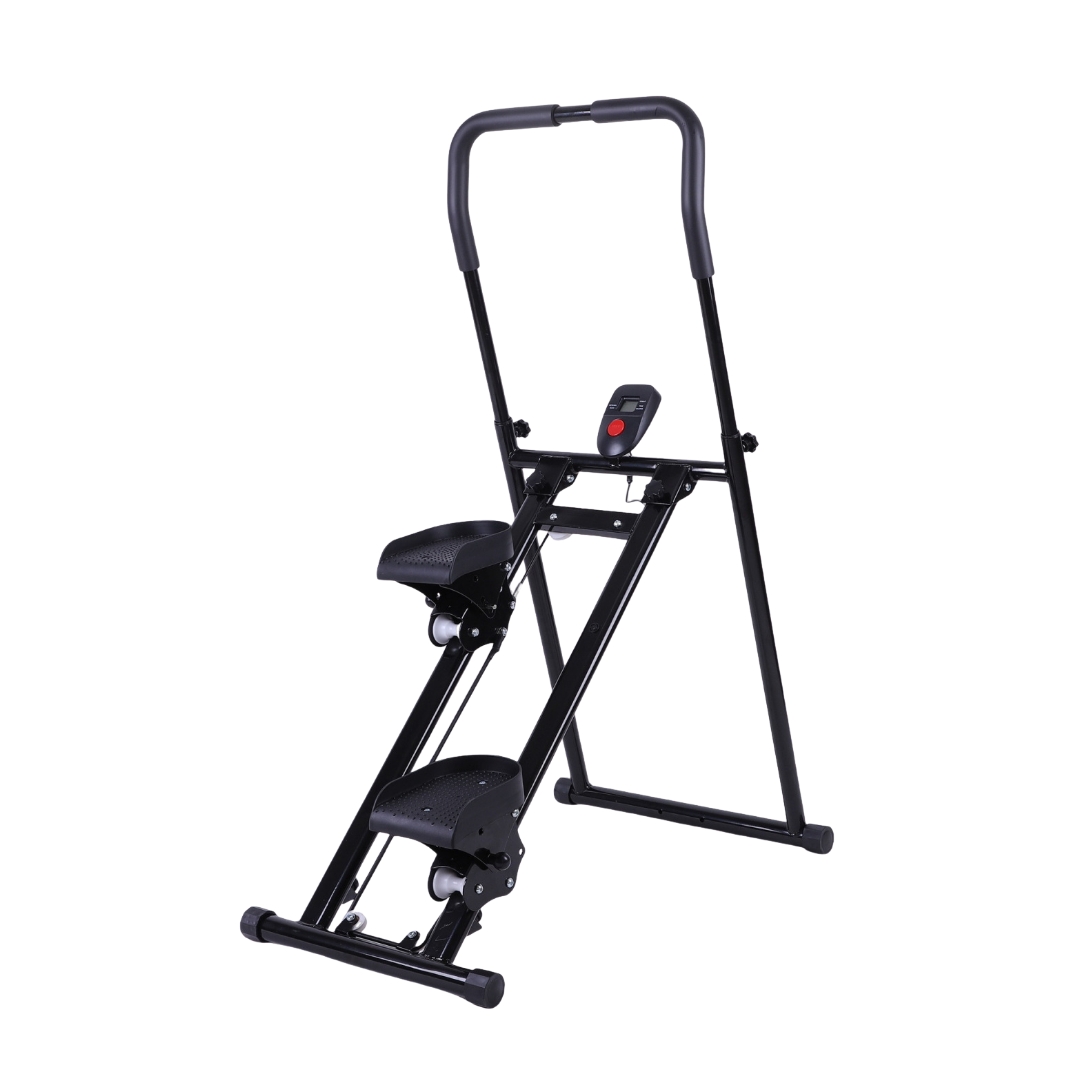 Компактный домашний тренажер, имитирующий подъем по лестнице. Лестничный тренажер рассчитан на вес пользователя до 120 кг. Вес самого тренажера примерно 10 кг. Положение педали регулируется для нагрузки различных мышц ног.